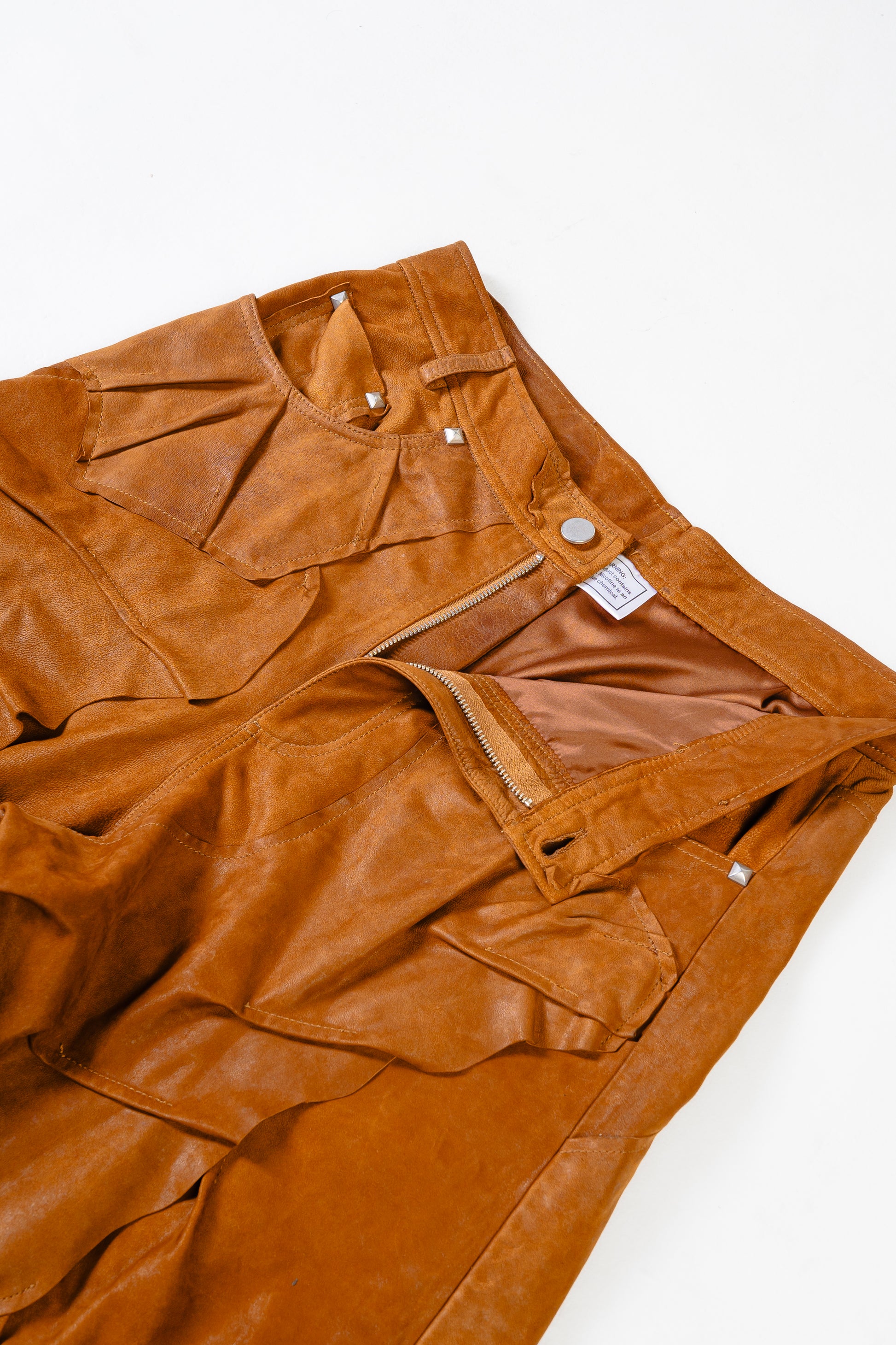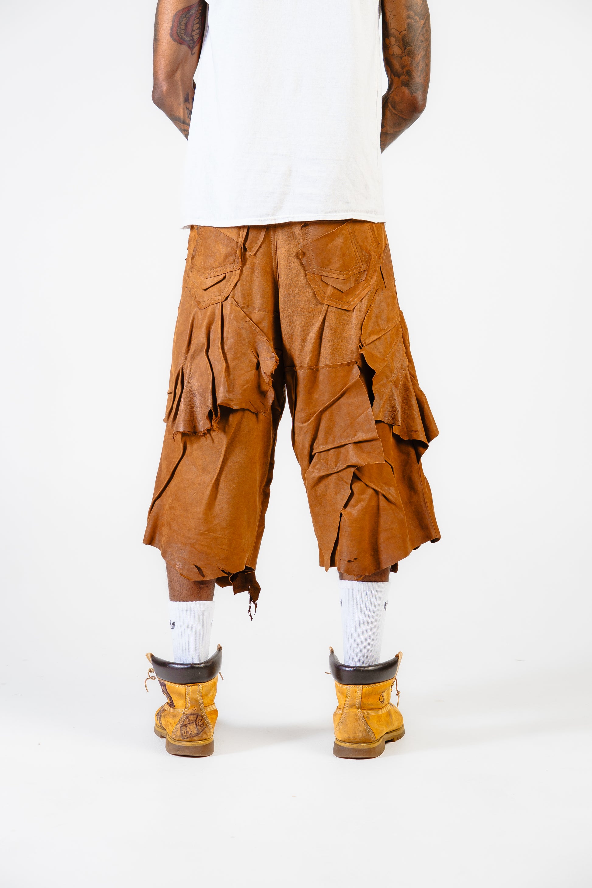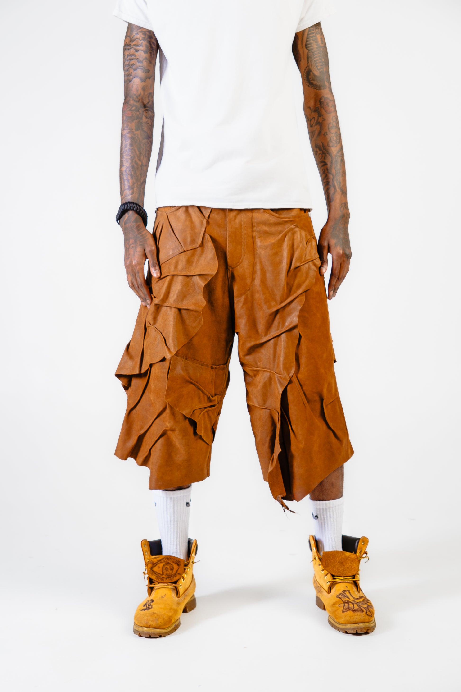 The Fronto Leaf Leather Shorts are made from 100% lambskin with a satin inner lining, featuring 5 pockets, custom mylar packaging, and hand tacking throughout. Leather details & textures may vary slightly.